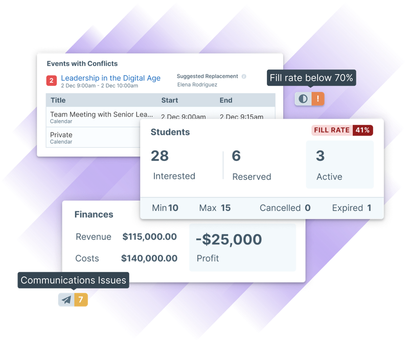 Click a conflict in the dashboard and you go directly to the issue. No digging through spreadsheets or cross-checking calendars. See instructor booking conflicts, missing resources, incomplete tasks, and low fill rates. Each conflict opens directly to the problem area, with clear next steps and suggested replacements. Now you can start to figure out what went wrong and fix it. No more back and forth.